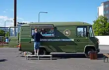 In military exercises and field camps, mobile canteens sell coffee, sweets and pastries. The cars are also often present at fairs where the Finnish Defence Forces have a stand. Soldiers' home associations also maintain camp soldiers' homes in large training areas, such as the shooting ranges of Pahkajärvi, Niinisalo and Rovajärvi.[10][11][12]