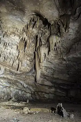 Solkota Cave formed in Sataphlia-Tskaltubo karst massif.[3] Cave entrance is at the bottom of a well in a karst topography covered by vegetation. From here steep corridor expands to 10-15 m and morphs into horizontal floor that leads to a chamber with height of almost 30 m. Cave has an interesting diversity of chemical sediments, stalactites and stalagmites. Of particular interest are stalactites of 5 m thickness, size which is rare in Europe. Also notable is an 8 m high stalagmite with the circumference of 8.5 m at it bottom and 4.5 m in the middle.