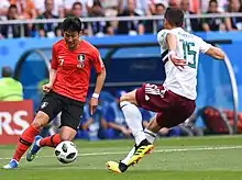 On 13 June 2017, Son broke his right forearm after falling awkwardly on his arm during a World Cup qualifier match in Doha against Qatar.[161] He was part of the team that saw Korea qualify for the 2018 World Cup after a 0–0 draw against Uzbekistan on 5 September 2017.[162] On 4 June 2018, Son was selected in 23-man squad for the World Cup.[163] On 23 June, Son scored a goal from outside the penalty area – a curling strike into the top corner – though his side was defeated with a 2–1 loss to Mexico in their second group stage match of the World Cup.[164] On 27 June, during their final group stage match, he scored the second goal in the 97th minute in their 2–0 victory over world champions Germany, sealing their elimination.[165]