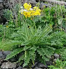 Perennial. Base woody. Leaves in a single large basal rosette up to 1 m across; pinnatifid, wooly, with a pointy tip. Scape up to 1.5 m, without bracts. Inflorescence an umbellate group of flower heads. Peduncles with 1 to several heads, wooly. Involucral bracts broad, very densely white-tomentose. Heads about 2.5 cm across with numerous yellow ray flowers but no disc flowers.[2]