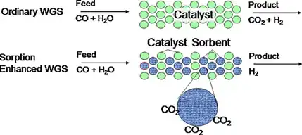 The conversion of carbon monoxide into carbon dioxide is enhanced by shifting the reaction equilibrium through CO2 adsorption and removal, the latter being one the produced species.[1]