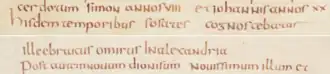 Sosates is known from a single line in the Excerpta Latina Barbari, an 8th-century AD Latin translation of a lost Greek chronograph of the 6th century. It is preserved in a single manuscript also of the 8th century.[2] It reads, "At this same time Sosates, the Jewish Homer, flourished in Alexandria" (Hisdem temporibus Sosates cognoscebatur ille Ebraicus Omirus in Alexandria).[3] It is one of five literary historical notices placed within a list of pharaohs that is correlated with a list of Jewish high priests.[4] The correlation, however, is erroneous, the dates of the pharoahs not lining up with those of the priests.[5][6] Sosates thus lived either during the time of the high priests Simon Thassi (142–135 BC) and John Hyrcanus (135–104) or during the reign of the Pharaoh Ptolemy XII (80–51). Shaye Cohen leans towards the former.[7] Richard Burgess, on the other hand, argues that the literary notices were originally added to the list of pharaohs and places Sosates in the reign of Ptolemy XII.[8]
