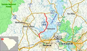 South Carolina Highway 188 (SC 188) is a 8.250-mile (13.277 km) state highway in the U.S. state of South Carolina. The highway travels through rural areas of Oconee County. It is known as Keowee School Road for its entire length.