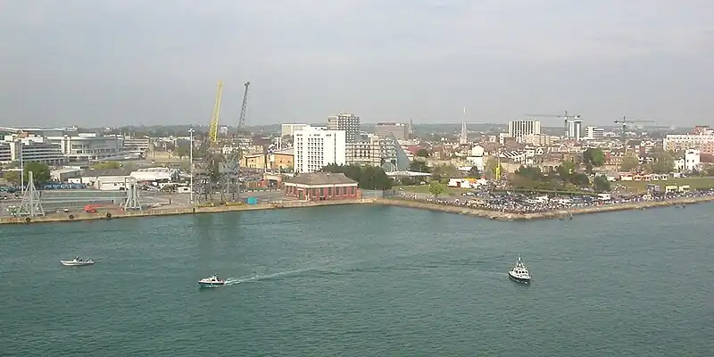 Part of the waterfront. The Westquay shopping centre can be seen on the left, with the spires of St Mary's and St Michael's churches. Spectators line the shores of Mayflower Park.