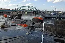 On 2 June 2008, divers from Mobile Diving and Salvage Unit Two in Norfolk, Virginia arrived and began preparations to raise the submarine. On 25 July 2008, she was brought to the surface by US Navy and Army divers. The work of pumping out water was completed in August 2008.[17] The sub was badly deteriorated and in need of substantial repair.[18]