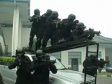 The tactics and organization of the UTK are primarily influenced by the German GSG-9, but with a difference; UTK operatives operate mostly in plain clothes and also perform undercover missions. With approximately 300 members, the UTK is deployed in cases of hostage taking, kidnapping, terrorism and extortion. The group may also be used to secure locations, neutralize targets, track down fugitives, escorting and protecting leaders and VIPs, and occasionally conduct sniper operations.[11][12] UTK members are trained to operate urban operations,[13] airborne operations, and underwater operations.