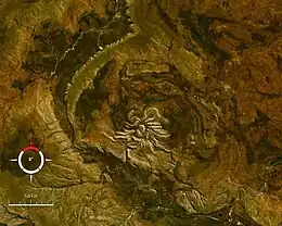 The unusual geological structure has been a puzzle since the 1950s, but it was not until shatter cones were discovered it the centre in the late 1970s that it was realized that it was an eroded impact structure.[2] The central area bearing shatter cones is interpreted as the relic of a central uplift with the outer limits of disturbance confined to a subcircular area about 11 x 13 km in diameter; the original crater may have been slightly greater than this due to the depth of erosion.[3] The asymmetry of the structure lead some geologists to conclude that the projectile had a very low angle trajectory from the north or northwest,[3] while others suggest that the asymmetry may be at least partly due to the effect of pre-existing topography.[2]
