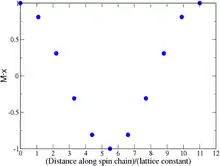 The projection of the magnetization of the same spin wave along the chain direction as a function of distance along the spin chain.