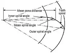 The spiral angle in a spiral bevel gear is the angle between the tooth trace and an element of the pitch cone, and corresponds to the helix angle in helical teeth. Unless otherwise specified, the term spiral angle is understood to be the mean spiral angle.