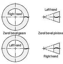 Also note that the designations right hand and left hand are applied similarly to other types of bevel gear, hypoid gears, and oblique tooth face gears.[1]