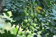 The fruit is a drupe ellipsoid to elliptic-ovoid, olive green becoming yellowish orange at maturity, 35–50 millimetres (1.4–2.0 in) × 25–35 millimetres (0.98–1.38 in); inner part of endocarp woody and grooved, outer part fibrous; mature fruit usually have 2 or 3 seeds. In China, it flowers from April–June and fruits from August–September.[2]