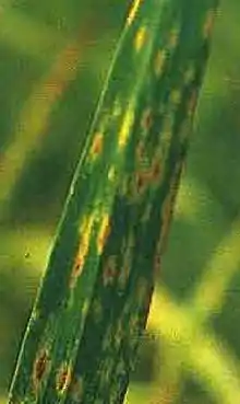 Spot blotch is a leaf disease of wheat caused by Cochliobolus sativus.[1][2] Cochliobolus sativus also infects other plant parts and in conjunction with other pathogens causes common root rot and black point.