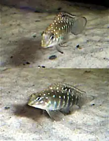 The spotfin goby cichlid (Tanganicodus irsacae) is an African species of cichlid endemic to Lake Tanganyika where it is only known from the northern end of the lake. They live amongst pebbles in the surf-zone. This species can reach a length of 7 centimetres (2.8 in) TL. This species can also be found in the aquarium trade.[2] Although presently considered the only species in the genus, another undescribed species is known from the Lukuga River (Lake Tanganyika's outflow river).[3]