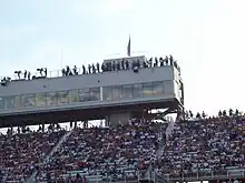A spotter in auto racing is a trained team member whose job is to relay information to their driver, keeping them alert of what is occurring on the track.[1][2] They are typically positioned higher, atop one of the grandstands or other support buildings, to see the entire track.[1] Spotters keep in constant contact with their drivers via two-way radio communication. Spotters are considered the drivers' "eyes" and are one of the more notable yet simple, safety measures adopted by professional auto racing in the past two decades.