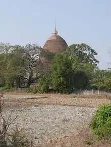 The Baw Baw Gyi Paya is an important Buddhist stūpa, located to the south of the ramparts of Sri Ksetra (at 18°47'10"N 95°17'7"E). It is a circular brick-built structure, raised on terrace to a height of approximately 46m. The shape of the stūpa is often compared to the Dhamek Stupa at Sarnath in India, with which it is likely coeval. With the fall of Sri Ksetra in the mid-ninth century, king Anawrahta opened the stūpa and removed the relic which was re-installed at this capital in Bagan. In its place, he left behind a number of signed votive tablets.[27]