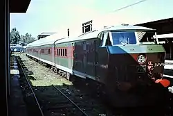 ![]() Class S5 engine 718 attached to a set of S5 carriages at Hikkaduwa, December 1980 | |