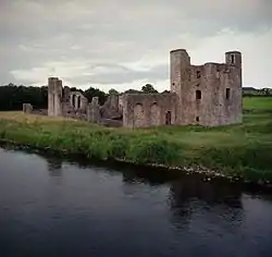 Among the remains is a church with nave and chancel and a large three-light window in the east wall, see above. Part of a long two-storey building remains, as does a 15th–16th century enclosing wall with a corner turret. There is also a 15th-century three-storey tower which is vaulted above ground level and forms part of the defensive wall.[5]