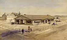 The original market was known as Market Square and people gathered there on Saturdays at the corner of King Street and New Street, (today's Jarvis St) stretching west to Church Street and south to Palace (today's Front St), with a creek running through the center from King south to the bay.[4] The plot set aside for the market was 5.5 acres (2.2 ha).[5] The market square was the centre of the city's social life where auctions took place and public punishments were carried out.[3] In the earliest days of the town, when slavery was still legal, this included auctions of black slaves.[6] Town bylaws prohibited the selling of butter, eggs, fish, meat, poultry, and vegetables between the hours of 6am and 4pm on Saturdays, except at the market.[6]