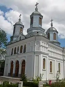 The original church on the site, a small wooden structure, was built in the 18th century by Romanian refugees from nearby Beștepe, who fled depredation by bashi-bazouk soldiers, preferring the security of Tulcea.[1] Regular services were conducted in Romanian by a priest from Transylvania. Later, the community received special approval to raise a larger church, complete with domes, becoming the town's first such building.[2]