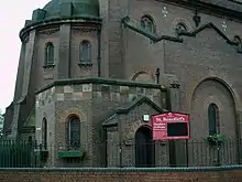 The architects Nicol and Nicol of Birmingham designed the present church as its permanent replacement. It was built in 1909[4] and consecrated on 30 April 1910.[3] It is in Byzantine Revival style, built of red brick with red sandstone dressings. The nave is flanked by north and south aisles. Between them are five-bay arcades with round-headed arches on sandstone piers. At the west end of the north aisle is a pedimented porch. A statue of Benedict of Nursia, the church's dedicatee, stands in a niche above its door.[4]