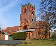 It is built in brick with terracotta dressings in Perpendicular style. The roof is in red tiles and lead. Its plan consists of a nave with north and south aisles, a tower at the crossing, and a chancel with north and south chapels. A two-storey vestry is on the south, and a porch is to the west of the north aisle. The tower is in three stages with a four-light Decorated style window above which is a terracotta frieze. In the second stage are small square windows. The upper stage contains two-light bell openings and a blind traceried frieze. The parapet is of stone with pinnacles at the angles and in the centre of each side.[1]