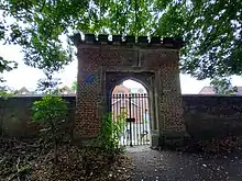 By 1526 the college, although still functioning, was in a state of disrepair and the canons were constantly arguing amongst themselves; the warden, who was over 80 years old, was frequently absent. In 1538, the college was dissolved and surrendered to the crown by the last warden, Richard Eden. In 1544, the king granted the college estate to Sir Thomas Paston for the sum of £1,280, although he seems never to have lived there. After passing through numerous hands, it was eventually purchased by the Borough of Sudbury for use as a workhouse and the remaining medieval fabric was demolished in 1836 to make way for a more suitable building.[14] Only the heavily restored gateway survives, standing on the west side of the churchyard; it is a Grade II listed building.[15]