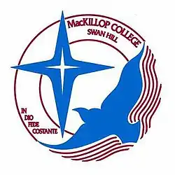 Moves to open a secondary school to service the Swan Hill, Kerang and Quambatook Parishes began in 1981; prior to this Catholic education was only available to primary school children in the area. The school was opened in 1987, having operated classes for students in Years 7 and 8 out of St Mary's Primary School since 1983.[1] Educating young people in remote areas is central to both orders.[2] The school is named for the Australian educationalist Mary MacKillop, and the school motto is that of the MacKillop family.[1]