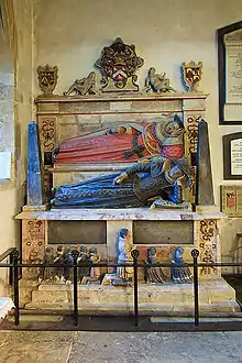 At the east end of the south aisle, on the south side, is the monument to Sir Thomas Fleming, Lord Chief Justice, who was one of the judges at the trial of Guy Fawkes in 1605 and died in 1613. This memorial[28][29] is known locally as "the floating Flemings",[4] depicting Lord and Lady Fleming in their scarlet and blue court robes, lying on their sides, with kneeling figures of the six sons and two daughters who survived him.[30] The inscription is in two panels on the base, and above the effigies are the arms of the Fleming and James families. The inscription reads:[31]