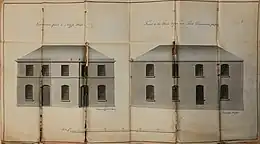 Plans submitted to the Dean of Guild's court show the Horse Wynd chapel as a simple Neoclassical building. The facade of five bays consisted of two storeys separated by a simple course of moulding. The walls were capped by a simple cornice and short attic storey while a pitched roof covered the building. The windows of the upper storey were rectangular while the openings on the ground floor (windows at the outer and central bays with doors in between) were segmental-arched. The central bay was slightly advanced with an advanced central panel in its attic sotrey. The plan shows the flank of the building as consisting of a simple wall of four bays and two storeys with segmental-arched windows. The chapel could seat 1,000 and the plans for the interior show with a bowed gallery.[52][53]