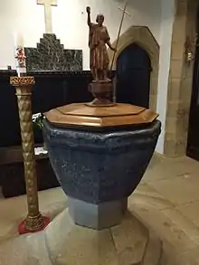 The font originally stood in Holy Cross Church, and would have been use by monks from Jarrow to baptise babies born in Wallsend. At some point after Holy Cross was abandoned the font found its way into Wallsend Burn (the stream which now forms the parish's northern boundary). It was rescued from there at some point in the 1800s and taken to Carville Hall, and eventually given to St Peter's by Mr Wigham Richardson in 1891.