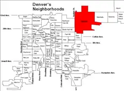![]() The location of Stapleton Airport on a map of Denver neighborhoods | |||||||||||||||||||||||||||||||