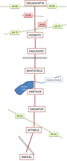 State Highway 35, commonly referred to as Sidlaghatta-Anekal Highway, is a state highway running from Sidlaghatta (North) to Anekal (South) passing through Hoskote, Kadugodi, Whitefield,[3] Varthur, Gunjur, Sarjapur, Attibele.[1] Part of it is maintained by the Karnataka Public Works Department and a part by Bruhat Bengaluru Mahanagara Palike. Majority of the highway is 2-laned, except for the section between Kadugodi and Varthur-Kodi which is 4 laned.