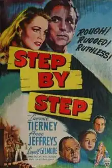 Step by Step is a 1946 American drama film directed by Phil Rosen, written by Stuart Palmer, and starring Lawrence Tierney, Anne Jeffreys, Lowell Gilmore, Myrna Dell, Harry Harvey, Sr. and Addison Richards. It was released on August 30, 1946, by RKO Pictures.[1][2][3]