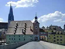 The south end of the bridge may have been the location of an ancient city gate.[1] The early 16th-century Amberg Salt Store (German: Salzstadel) and the early 17th-century Regensburg Salt Store were built against it.[2] The Regensburg Sausage Kitchen east of the Salt Store was built against the city wall in the 14th century; an earlier building on the same site probably served as a canteen for the workers building the bridge.[3] Further east is the Regensburg Museum of Danube Shipping.