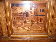 She had the sculptor Tullio Lombardo create her a new marble doorway from the studiolo to the grotto between 1522 and 1524. She also commissioned a new doorway for the entrance to the Studiolo from Gian Cristoforo Romano, with four bas reliefs, tondoes and multicoloured marble.[2] The grotto itself contained wood-inlay panels from the earlier studiolo, produced in 1506 by Paolo and Antonio della Mola.[3] In 1531 she added Allegory of Virtue and Allegory of Vice, both by Correggio, to the paintings in her studiolo. A 1542 inventory survives, giving some idea of how the paintings and objects were finally displayed on principals of harmony and symmetry but in a very high-density arrangement.