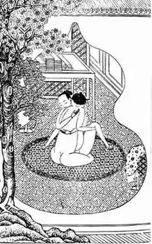 Su'e pian is more than 10,000 Chinese characters long and comprises some forty-three chapters and ninety illustrations collected in four volumes.[3] Each sexual position described in the novel is given a name such as "Stopping the Horse to Pull the Saddle" (駐馬板鞍),[5] "Flowers Longing for Butterflies" (花開蝶戀),[4] "Boat Widthwise Over the Ferry" (野渡橫舟),[5] and "The Union of Yin and Yang" (囫圇太極).[5]