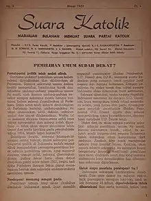 In Indonesia, Suara Katolik (English: Catholic Voice) is the official newspaper of the Catholic Party. It began to be published on 1924, as the mouthpiece of the Javan Catholic Political Union (PPKD).[2] The newspaper focused on social affairs.[3]