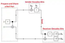 When the sender and receiver share a Bell state, two classical bits can be packed into one qubit. In the diagram, lines carry qubits, while the doubled lines carry classic bits. The variables b1 and b2 are classic boolean, and the zeroes at the left hand side represent the pure quantum state . See the section named "The protocol" below for more details regarding this picture.