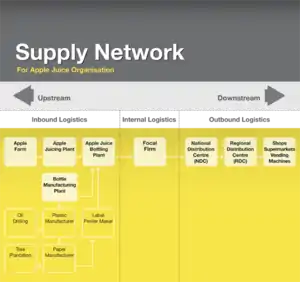 A supply-chain network can be used to highlight interactions between organizations as well as to show the flow of information and materials across organizations.[2] Supply-chain networks are now more global than ever and are typically structured with five key areas: external suppliers, production centers, distribution centers (DCs), demand zones, and transportation assets.[3]