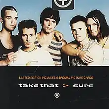 "Sure" is a single by English boy band Take That, released as the lead single from their third studio album, Nobody Else (1995). It was written by Take That's lead singer Gary Barlow and fellow band members Robbie Williams and Mark Owen.[4] Released on 3 October 1994 by RCA and BMG, the song became the band's fifth number one on the UK Singles Chart and has received a silver disc certification in the UK for selling over 200,000 copies. Q Magazine ranked "Sure" at number 86 in their list of the "1001 Best Songs Ever" in 2003.[5]