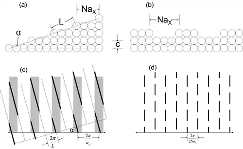 Surface features in a material produce variations in the CTR intensity, which can be measured and used to evaluate what surface structures may be present. Two examples of this are shown in Fig. 3. In the case of a miscut at an angle , a second set of rods is produced in reciprocal space called superlattice rods, tilted from the regular lattice rods by the same angle, . The X-ray intensity is strongest in the region of intersection between the lattice rods (grey bars) and superlattice rods (black lines). In the case of ordered alternating steps, the CTR intensity is chopped into segments, as shown. In real materials, the occurrence of surface features will rarely be so regular, but these two examples show the way in which surface miscuts and roughness are manifested in the obtained diffraction patterns.