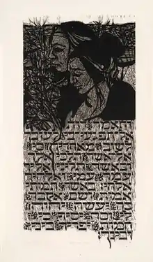 Much of Walters's work in the 1960s focused on expressive black-and-white woodcuts and lithographs of metaphorical and allegorical human figures, often Old Testament subjects or musicians.[39] St. Louis Post-Dispatch writer Mary King described the "vertically curling and knotting" central form of the woodcut Fragment I as an "agitated tower of textures and line shapes" that was "only incidentally a figure."[40] Depicted in thorny, ropy lines that thickened into shapes, divided or slid into one another like branches or flowing liquid, they drew comparisons to the work of Leonard Baskin.[23][40] In a review of her 1964 solo exhibition, Milwaukee Journal critic Donald Key suggested her bold, spiraling and stretched linear patterns evoked rising musical passages or the vibration of string tones (e.g., Small Musician After Degas).[23][14] Her densely worked Biblical works—some incorporating Hebrew writing—evoke archetypes and symbols that critics characterized as dream-like, somber and mysterious.[41][40][11][42]