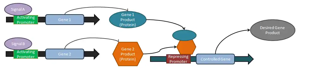 The logical Negated AND gate.[15][16] If Signal A AND Signal B are present, then the desired gene product will NOT result. All promoters shown are inducible. The activating promoter for the output gene is constitutive, and thus not shown. The constitutive promoter for the output gene keeps it "on" and is only deactivated when (similar to the AND gate) a complex as a result of two input signal gene products blocks the expression of the output gene.
