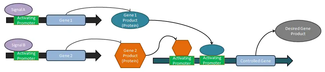 The logical AND gate.[15][16] If Signal A AND Signal B are present, then the desired gene product will result. All promoters shown are inducible, activated by the displayed gene product. Each signal activates expression of a separate gene (shown in light blue). The expressed proteins then can either form a complete complex in cytosol, that is capable of activating expression of the output (shown), or can act separately to induce expression, such as separately removing an inhibiting protein and inducing activation of the uninhibited promoter.