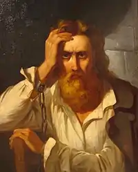 Louis-Philippe's secret agents passed the information of Konarski's true identity to the Russians and he was arrested on May 27, 1838 near Vilna (modern Vilnius). Imprisoned in the former Basilian monastery, Konarski could do little but to watch most of his comrades arrested in the following months, as Prince Alexey Trubetskoy was able to force some of Konarski's men to inform on the other members of the Union. Tried for high treason, Konarski tried to blame all on himself and portrayed his comrades as either manipulated or insane. He came into contact with one of the guards, a former Decembrist Lt. Aglay Kuzmin-Karavayev (Russian: Аглай Константинович Кузьмин-Караваев), who planned Konarski's escape, however Kuzmin-Karavayev was himself arrested (together with other some 30 helpers and sympathizers) after the betrayal of the escape.[6] Finally Konarski was sentenced to death by firing squad and was executed in Vilna on February 27, 1839. His grave was then trampled with horses and was never found.