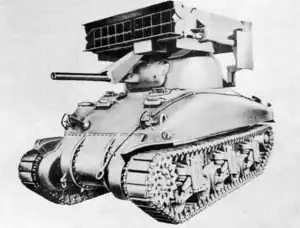 The 7.2-inch Multiple Rocket Launcher T40/M17 Whizbang (sometimes spelled Whiz-Bang or Whiz Bang) was a tank-mounted multiple rocket launcher used by the United States Army during World War II. The launcher was mounted atop 75mm variants of the M4 Sherman, and fired a barrage of 7.2 in (180 mm) rockets from 20 launch tubes.[1] It was developed and used in the late stages of the war, and saw limited combat in 1944–45.[3]