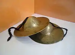 The taal, manjira (also spelled manjīrā or manjeera), jalra, karatala, kartal or gini is a pair of clash cymbals,[1] originating in the Indian subcontinent, which make high-pitched percussion sounds. In its simplest form, it consists of a pair of small hand cymbals.[2] The word taal comes from the Sanskrit word Tālà, which literally means a clap. It is a part of Indian music and culture, used in various traditional customs e.g. Bihu music, Harinaam etc. It is a type of Ghana vadya.