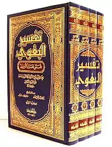 Tafsīr al-Baghawī (Arabic: تفسير البغوي), also known as Ma‘ālim al-Tanzīl, is a classical Sunni tafsir (Qur'anic exegesis) by Husayn b. Mas'ūd al-Baghawī (d. 1122), written as an abridgement of Tafsir al-Thalabi by al-Tha'labī (d. 1035). It is generally classified as one of the books of narration-based tafsir, as it collects and presents many statements from the Sahabah and Tabi'oon. The book primarily relies on 11 reliable chains of narrations, which al-Baghawi mentions in the introduction to his work.[1] It currently exists in four volumes and eight volumes in its Lebanon edition and Cairo edition respectively.