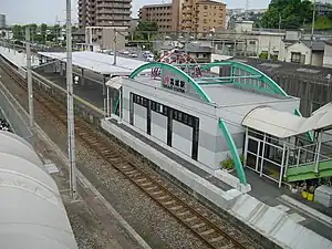 The station consists of an island platform serving two tracks at grade. The station building is a small modern concrete structure located on the island platform and is accessed by a footbridge which also serves as a free passage, linking streets on both sides of the track. A staffed ticket window is located inside the station building.[2][3][4]