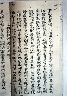 In the beginning of the Kojiki (Records of Ancient Matters), Takamagahara is mentioned as the birthplace of the gods.[2][3][4][5] It is assumed that Takamagahara existed in clouds above sea because there is a scene in which Kuniumi (国生み), the god of islands, lowers his spear to form an island. Also, when the Goddess of the sun, Amaterasu (天照大御神) was born, she was commanded to rule Takamagahara by Izanagi (伊弉諾), the creator deity of creation and life.[6][7][8] In the part related to Susanoo (スサノヲ, the brother of Amaterasu), Takamagahara is described as the place where many gods live with Ama-no-yasukawa (天の安河), Ama-no-iwato (天岩戸), paddy fields, and a place for weaving, giving an impression that life was close to the human world.[9][10] It is stated that the Ashihara-no-Nakatsukuni (葦原の中つ国, the world between Heaven and Hell) was subjugated by the gods from Takamagahara, and the grandson of Amaterasu, Ninigi-no-Mikoto (瓊瓊杵尊), descended from Takamagahara to rule the area. From then on, the emperor, a descendant of Ninigi-no-Mikoto owned Ashihara-no-Nakatsukuni.[11][12]